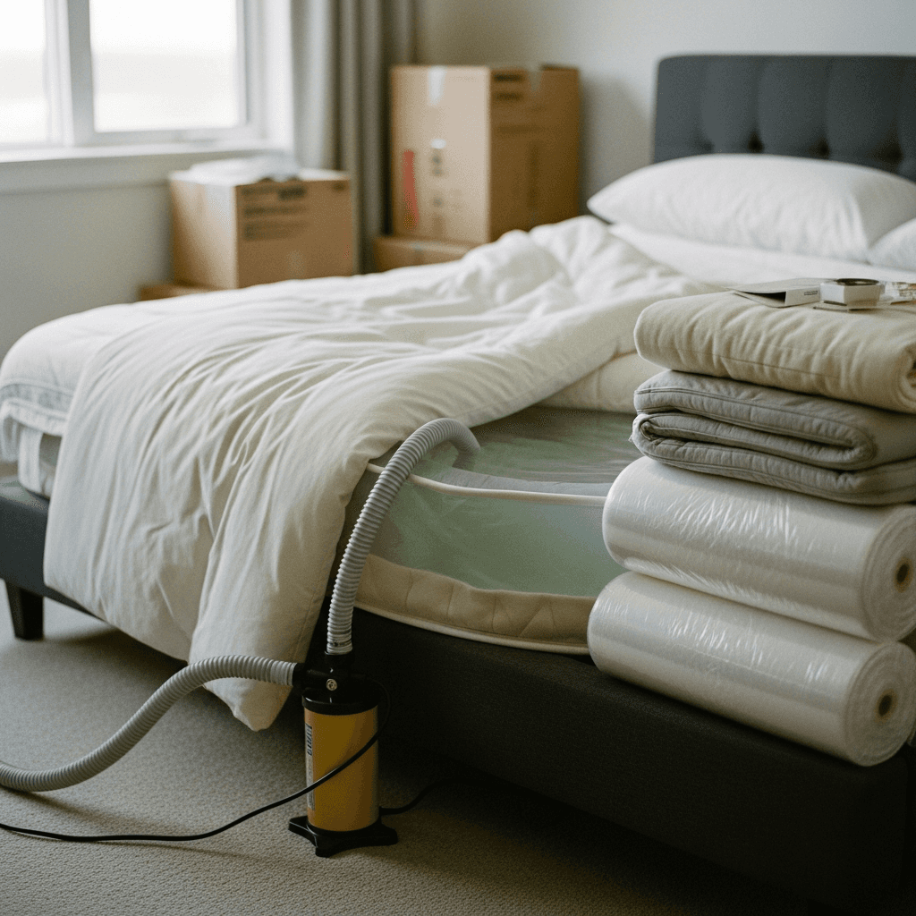 Wir entleeren die Matratze mit Spezialpumpen und schützen sie mit hochwertigem Verpackungsmaterial – für maximalen Schutz beim Transport.